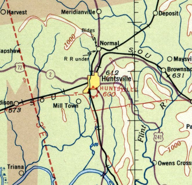the original Huntsville Airport was no longer depicted (having been replaced by a new field somewhat to the south).