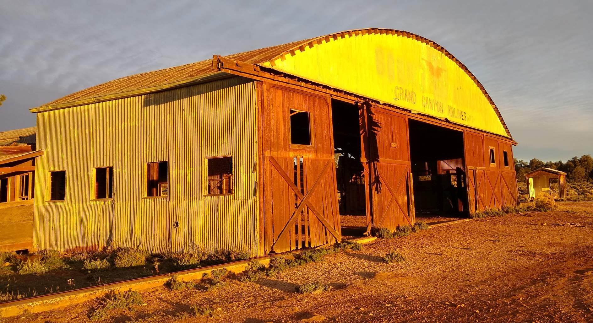 A retouched 2/8/15 photo by Cassy Borg of the 80+ year-old hangar which remains standing at Grand Canyon Red Butte Airport.