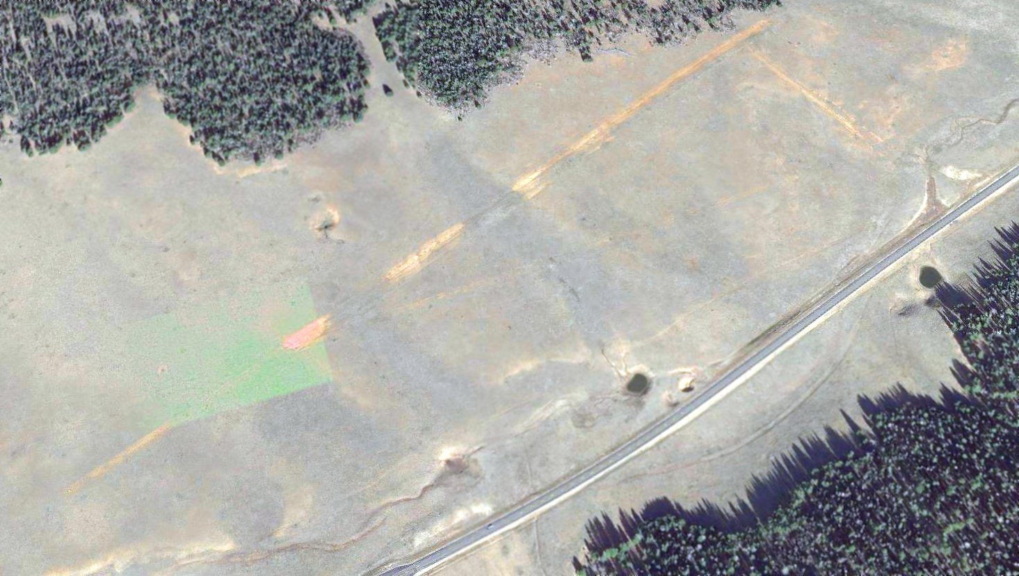 and there are a few foundations along the west side of the midpoint of the runway, possibly for some hangars or other airport-related buildings.