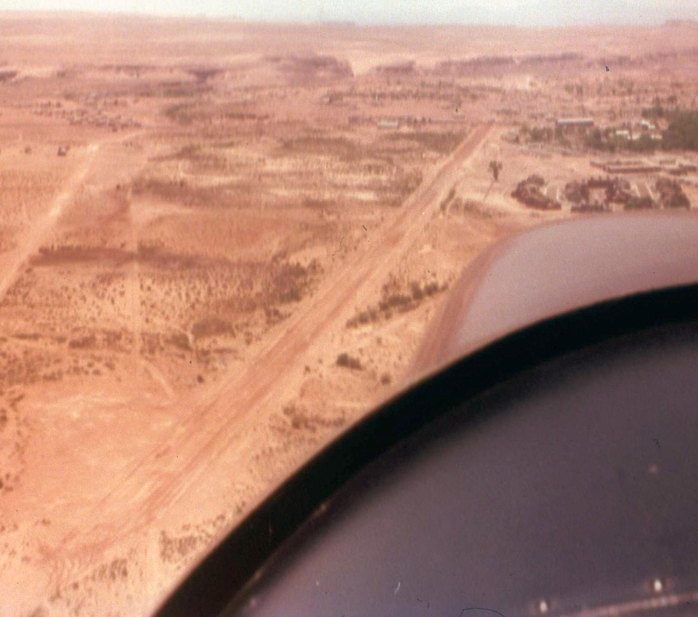 A circa late 1980s aerial view by David Stevens looking south along the unpaved runway of the 2nd location of Tuba City Airport.