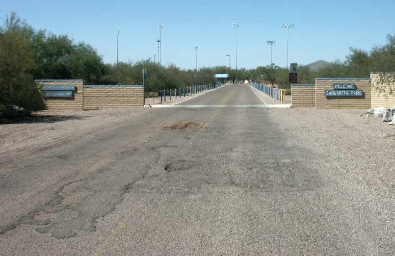 An October 2004 photo by Tim Tyler of the entrance to Sahuarita Park, looking along the former runway.