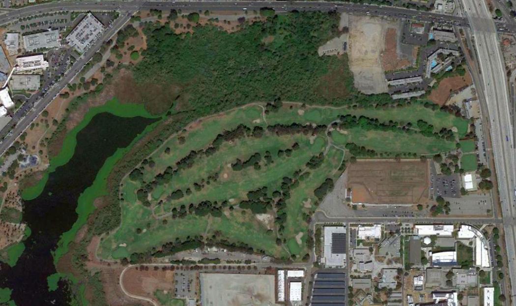 As seen in a 2024 aerial view looking northwest, a large industrial facility covers the site of Reeves Field.