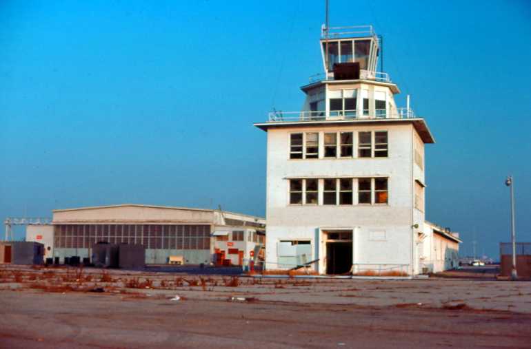 A circa 1975-76 photo by Jim Babin of the San Pedro control tower & several hangars.