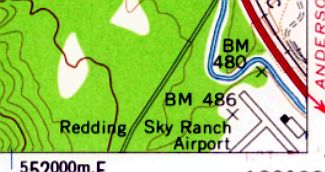 The 1957 USGS topo map depicted Redding Sky Ranch Airport as having 2 runways, with a building on the east side.