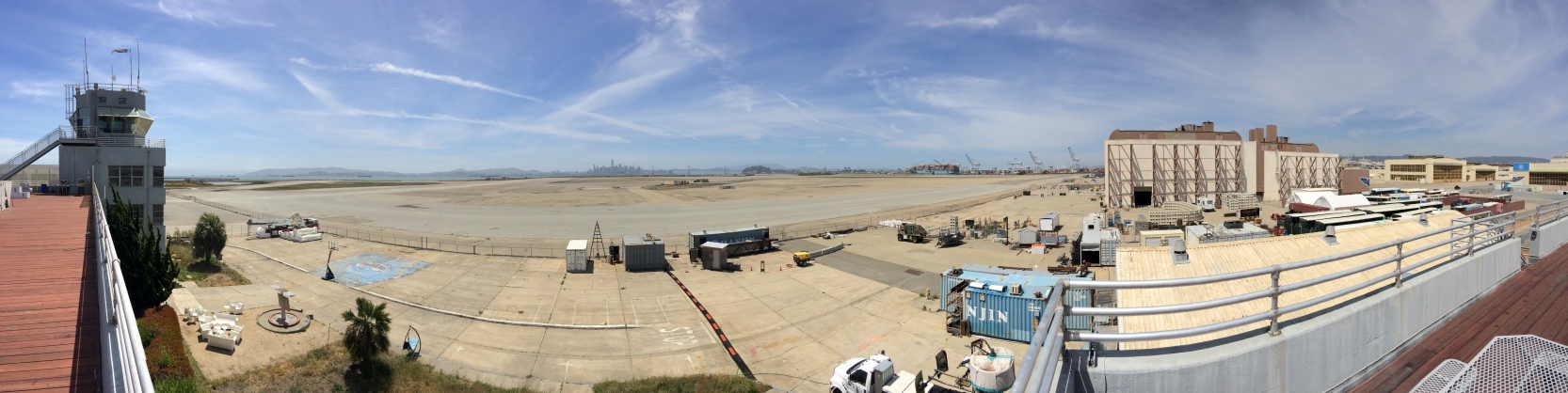 A 5/10/18 panoramic photo by Jonathan Westerling of the NAS Alameda control tower, ramp, runways, and hangars.