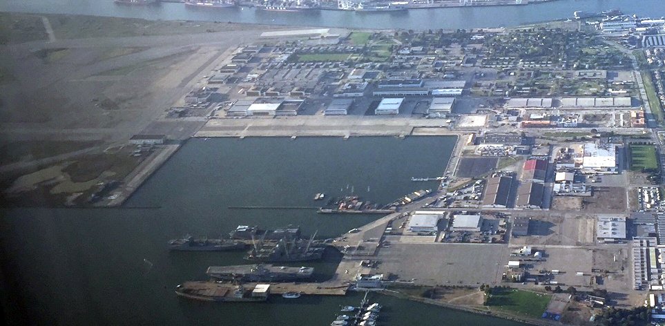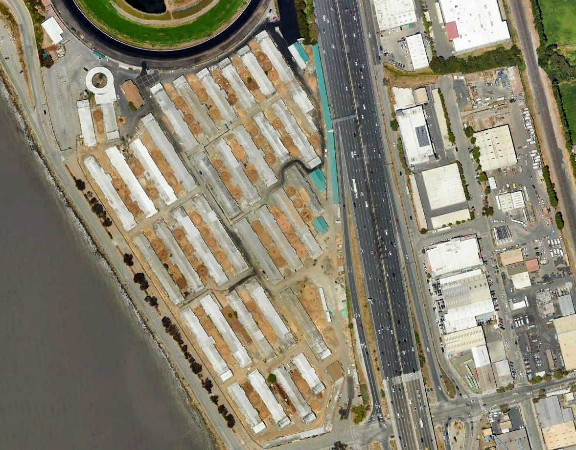 A 4/18/20 aerial view by Kevin Walsh looking north at the former NAS Alameda hangars & ramps.