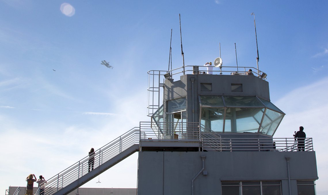 A 9/21/12 photo of the Space Shuttle on top of the Shuttle Carrier Aircraft 747 overfling the NAS Alameda control tower (copyright Makani/Andrea Dunlap used with permission, courtesy of Jonathan Westerling).