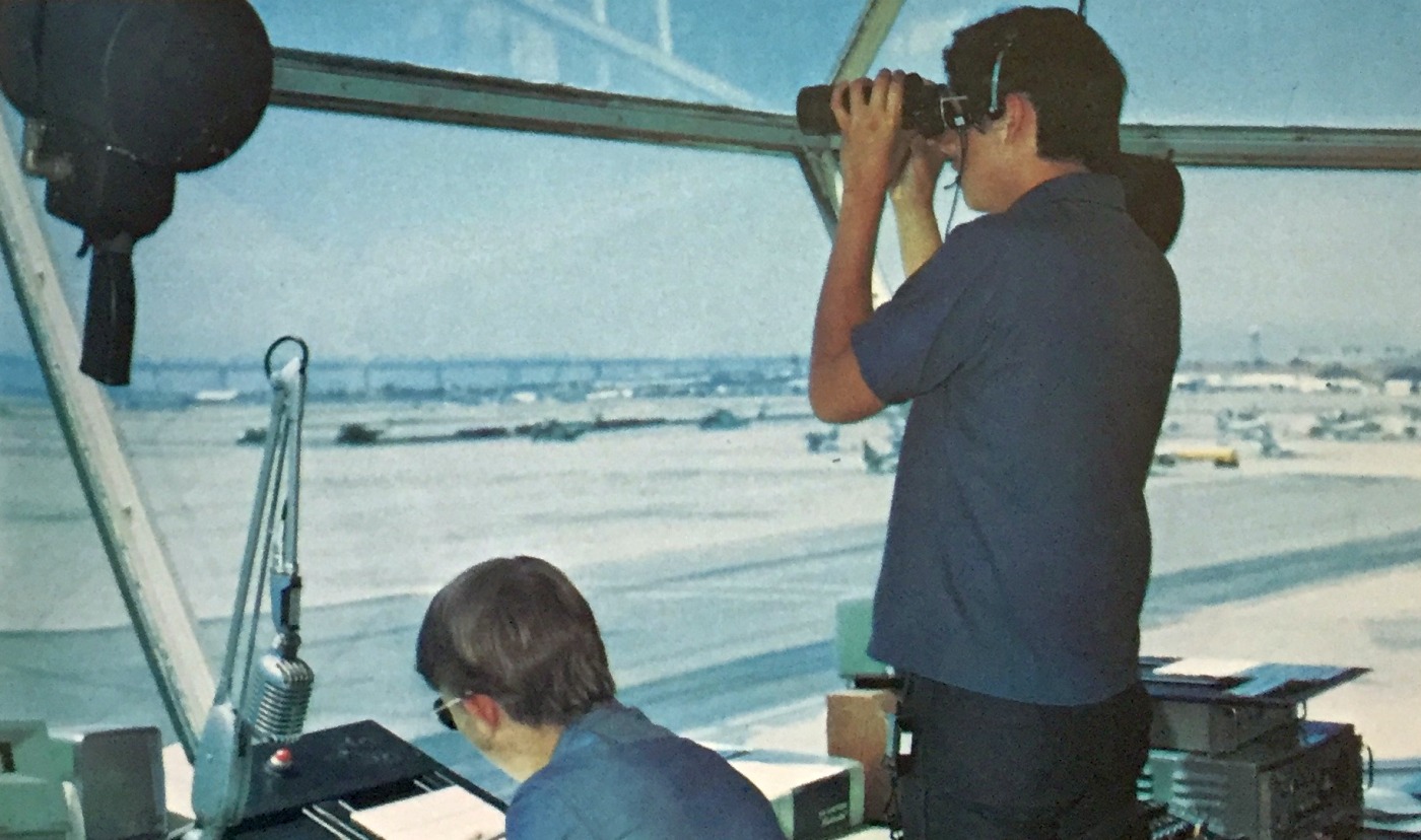 A 5/10/18 photo by Jonathan Westerling looking out from the NAS Alameda control tower, showing the same perspective as the 1973 photo.
