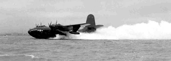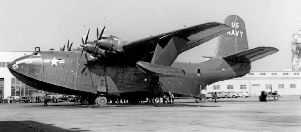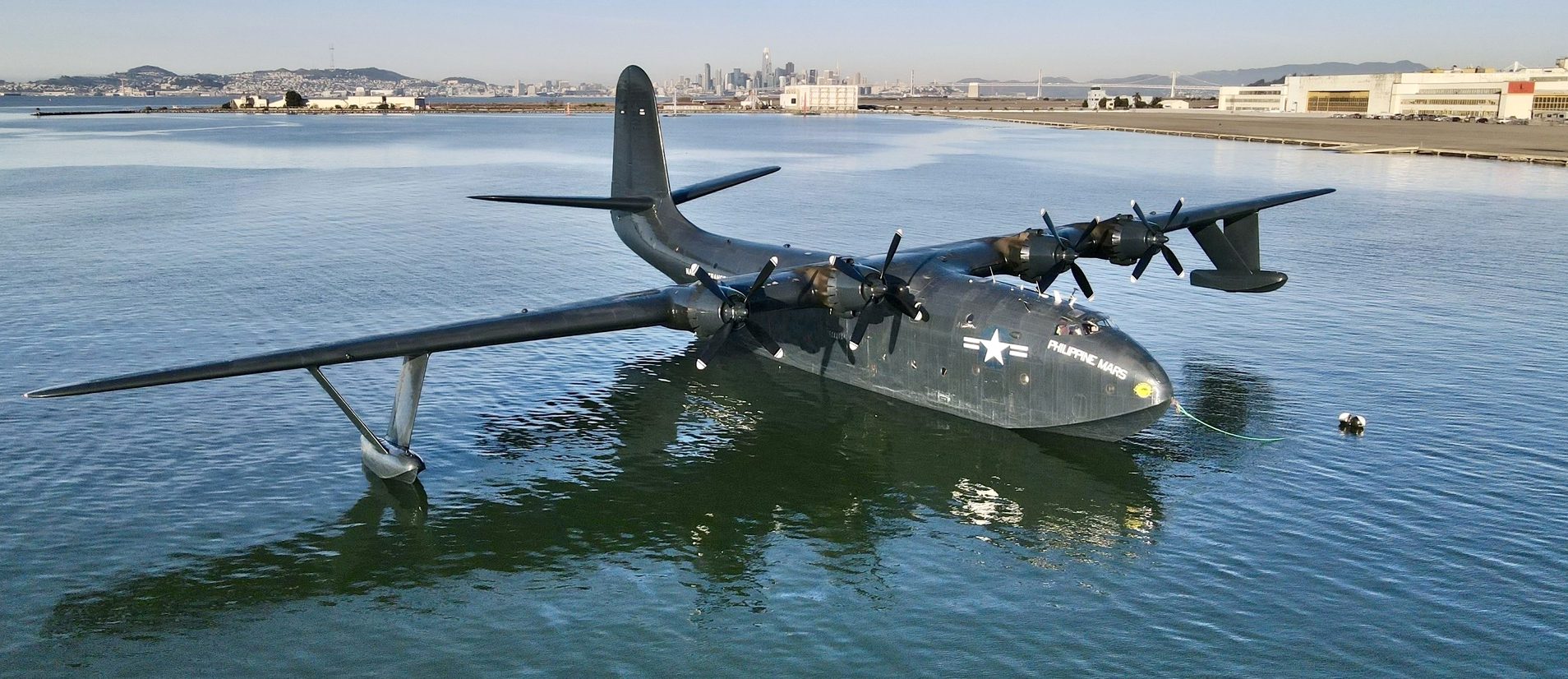 A 2/9/25 photo of Martin JRM-1 Philippine Mars during its stop at Alameda, with the hangars visible in the background.