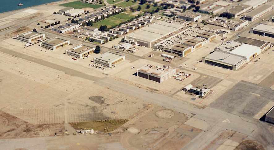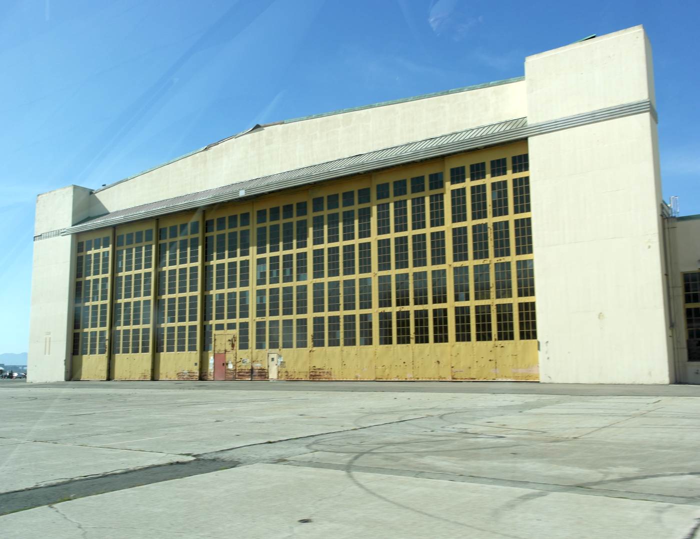 A circa 2008 photo of the hangars of Alameda's Naval Air Rework Facility.