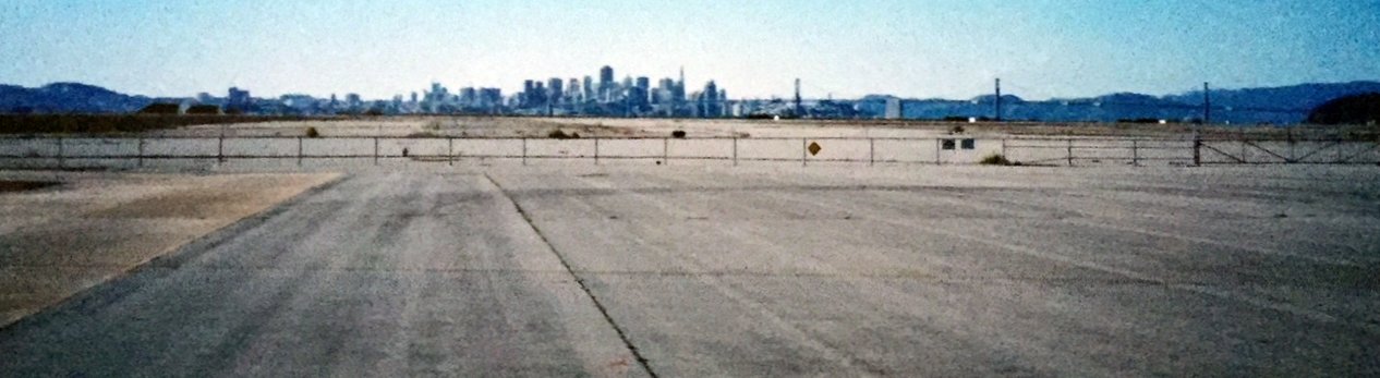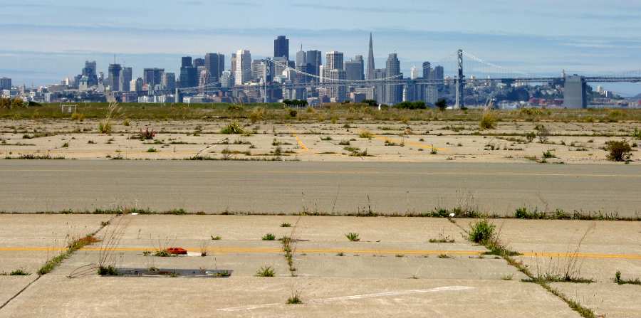 A 2004 photo by Tim Tyler looking west along one of Alameda's abandoned runways, with the San Francisco skyline in the background.