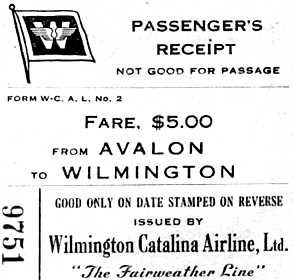 A circa 1931-41 passenger's receipt from the Wilmington-Catalina Airline,