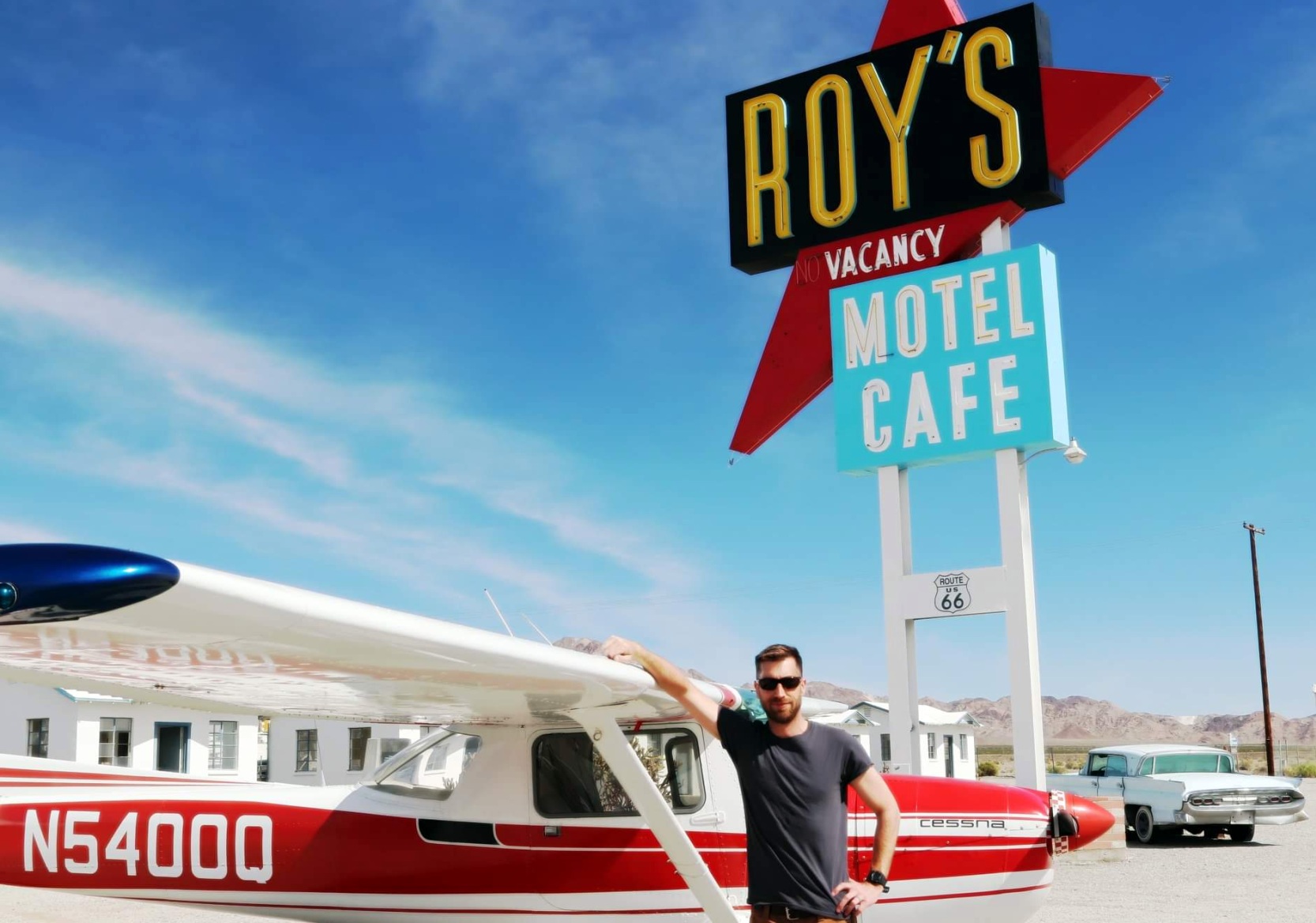 A 2/27/20 photo by Brian Ogilvie of he & his Cessna 150L at in front of the Roy's Motel Cafe sign at Amboy Airport.