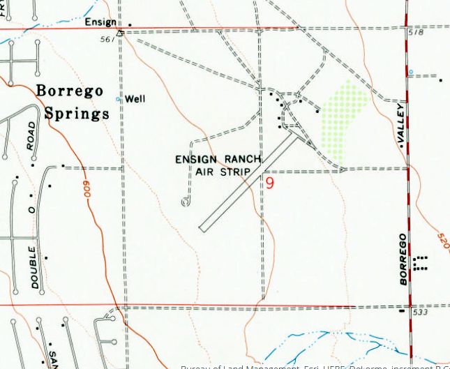 The site of Ensign Ranch Airfield is located east of the intersection of Borrego Springs Road & Tilting T Drive.