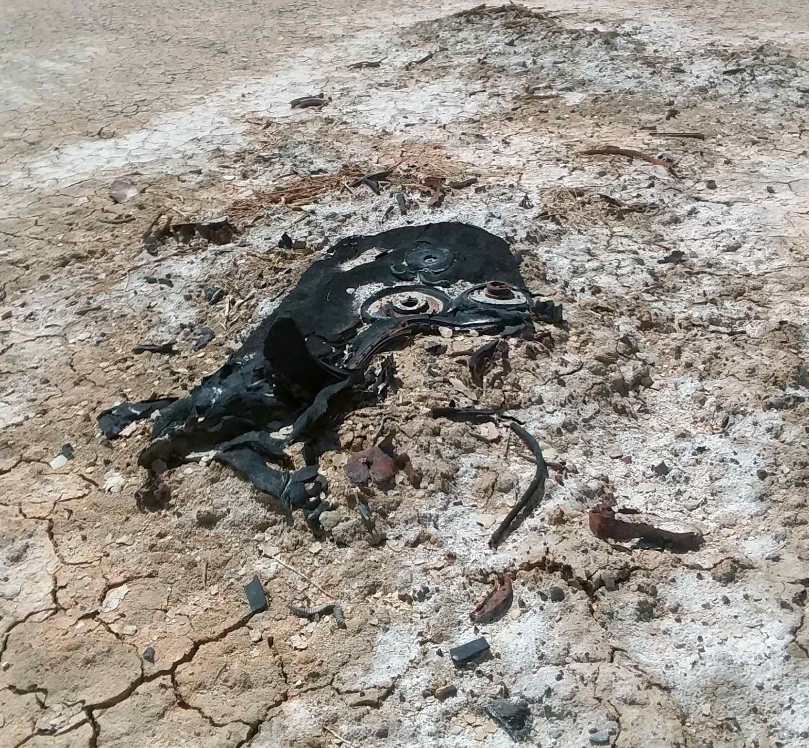 A 6/1/20 photo by Aris Lazerson of unidentified burned wreckage at Clarks Dry Lake.