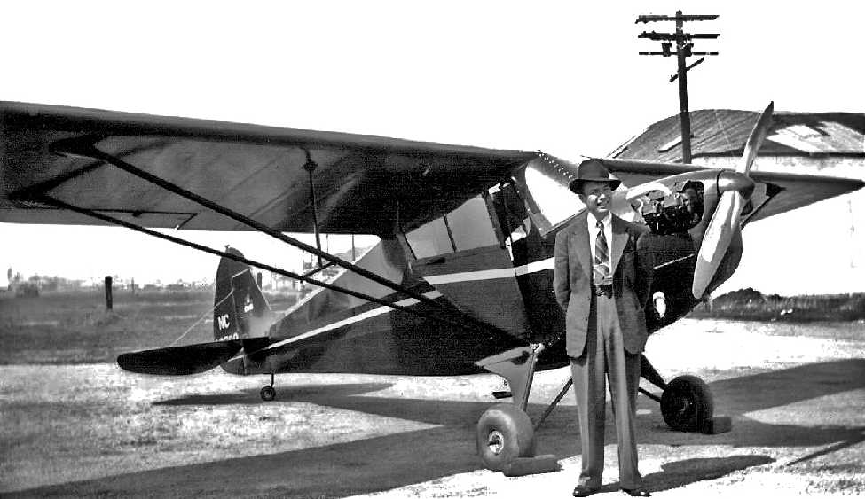 A 1939 photo of Arnet Speer in front of a Piper or Aeronca high-wing monoplane, likely taken at Speer Airport (courtesy of Joanne Lillevold).