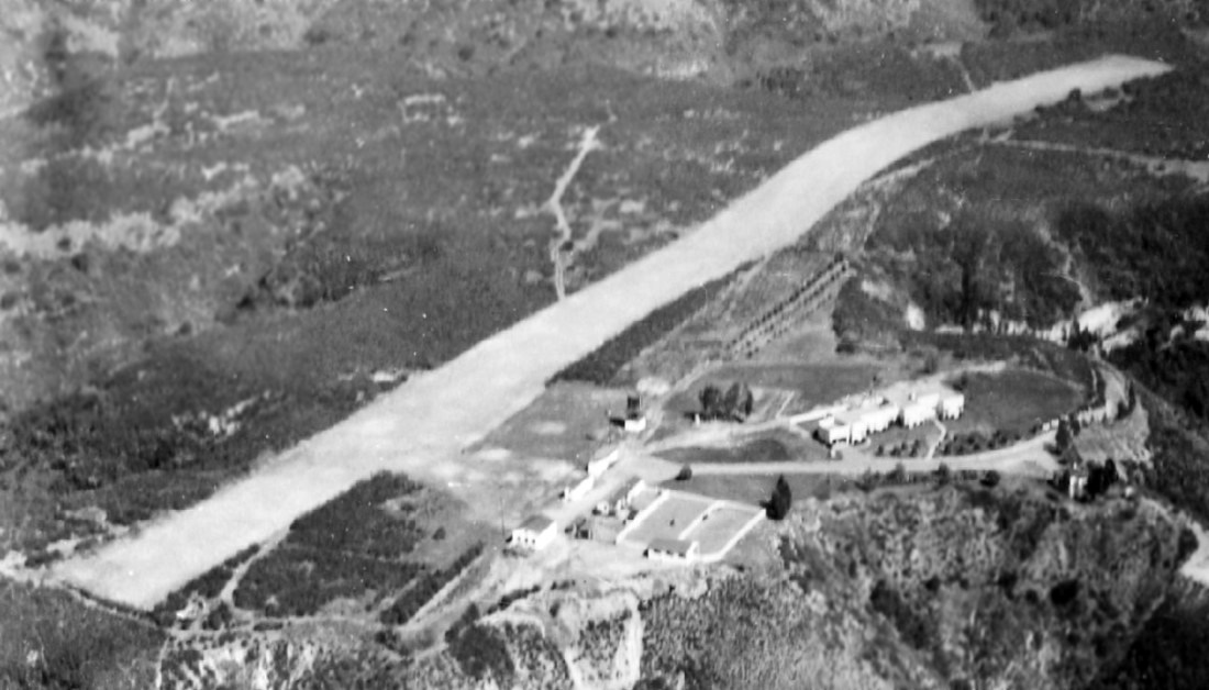 A circa late 1940s – early 1950s aerial view of Gillies Airport, showing the hilly runway on top of the mesa.