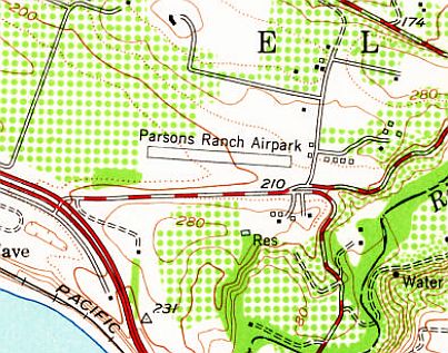 The 1952 USGS topo map depicted “Parsons Ranch Airpark” as having a single east/west runway with 2 small buildings on the east side.
