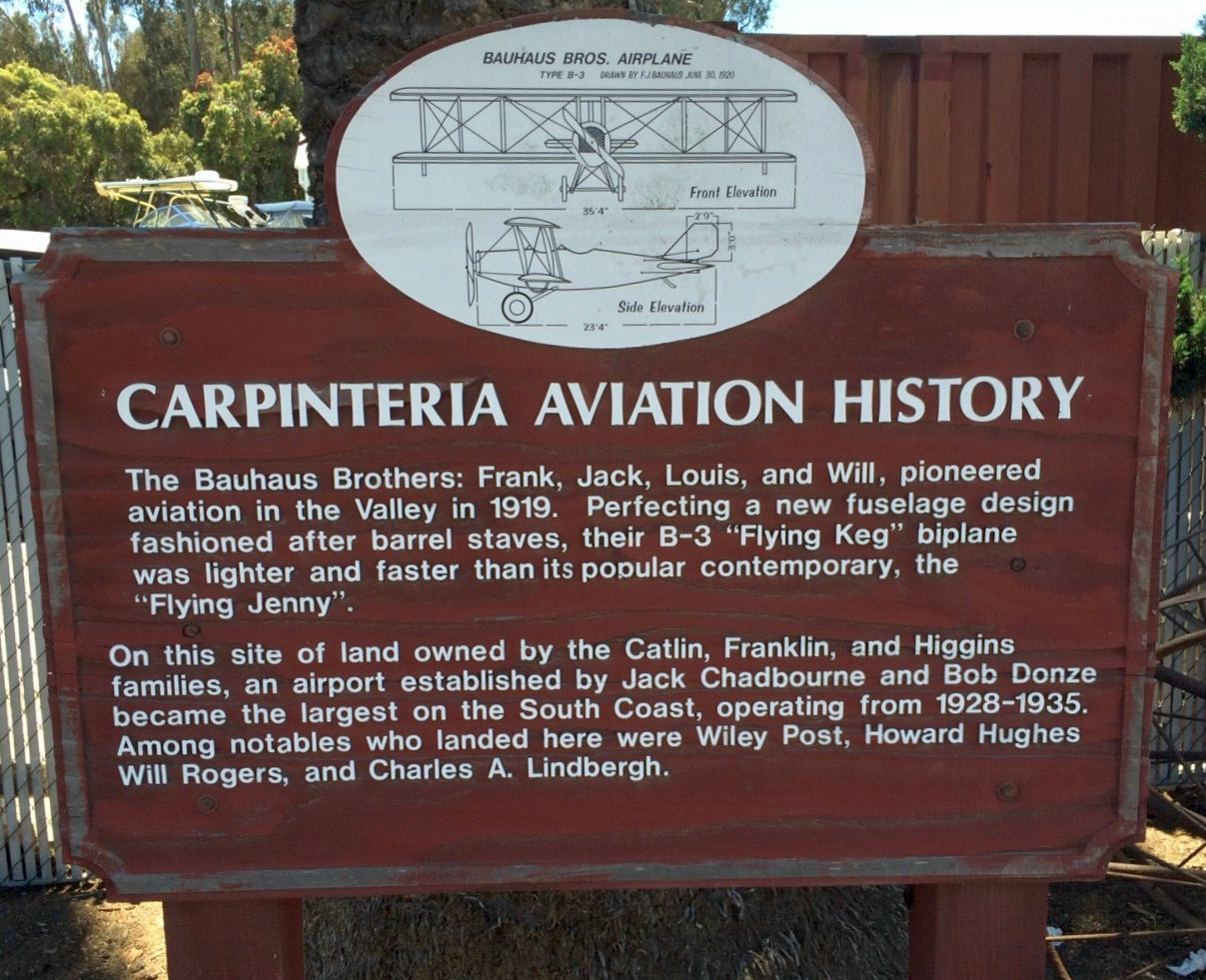 According to the text of a historic sign on the site of Carpinteria Airport photographed in 2016 by Charles Ctuart,