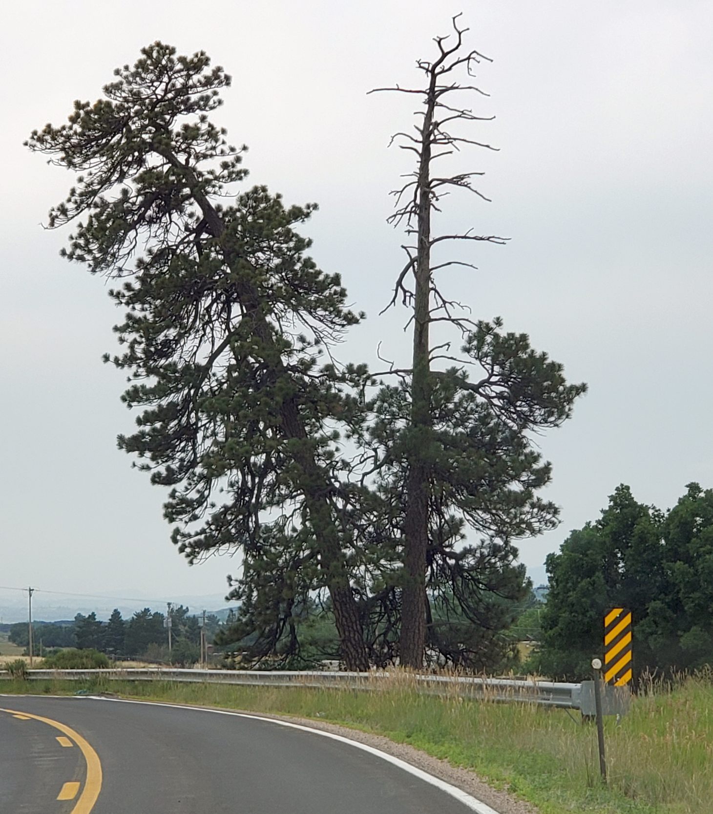 A 7/14/21 photo by Frank Niehus “of the 2 pine trees on the south end of the [site of] Littleton Airport. They are still there & one is dead but still standing.”
