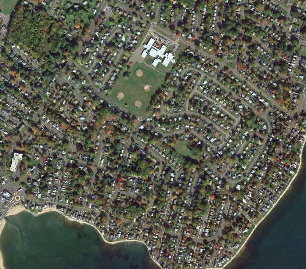 A 2003 aerial view by Jeff Franklin of the remaining runways at Rentschler Field, with the new UConn stadium on the left.