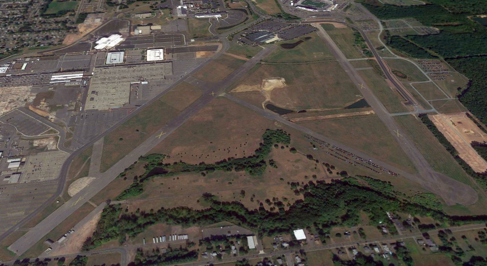 A 2017 aerial view looking north at the remaining runways at Rentschler Field.