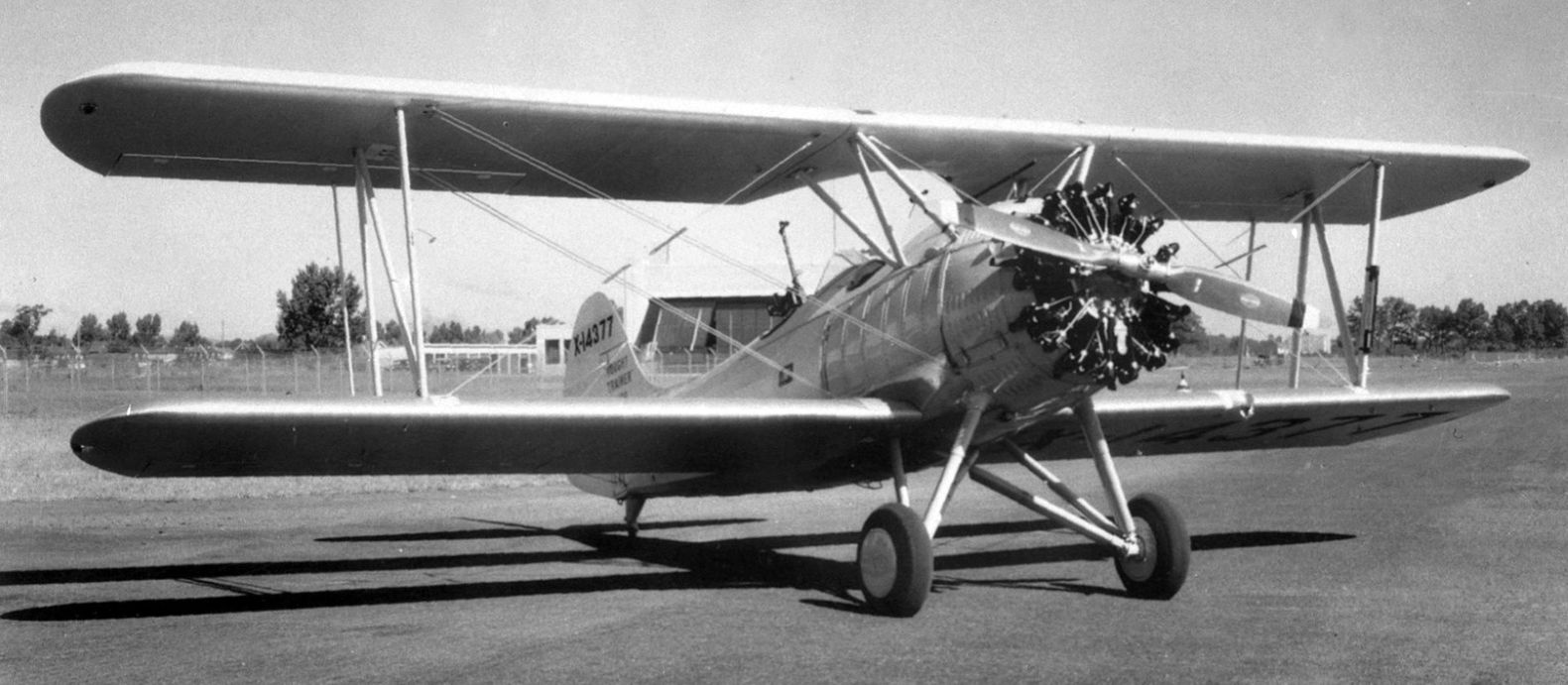 A 1958 photo (courtesy of Edd Weninger) of a Waco biplane of Bethany Airport Aerial Advertising, with the Bethany hangar visible in the background.