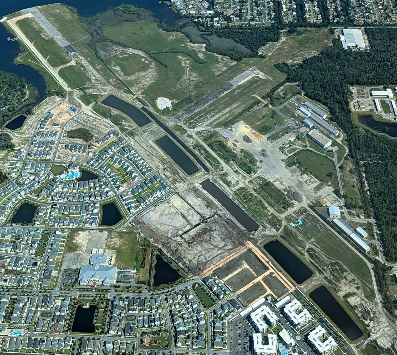 A 2022 aerial view looking northwest showed the southern portion of the Open Sands runway covered in trees, and the northern end covered in houses.