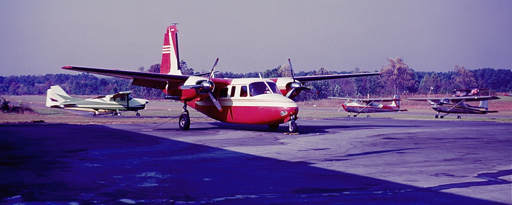 A 1971 photo by Robert Brown of a Cessna 195, N195RE, at Stone Mountain Airport.