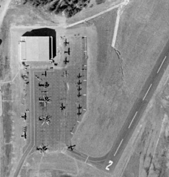 The runway & building configuration was the same as depicted in the 1952 photo, but the number of aircraft visible on the field had increased to 6.