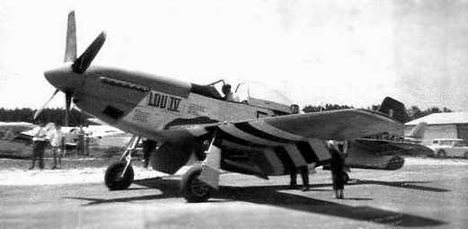 A circa late 1960s photo by Robert Brown of Dave Forrest in his P-51D Mustang passing through Stone Mountain Airport, pictured near the gas pumps.