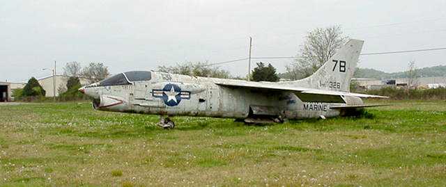 A sad 4/10/04 photo of a once-mighty supersonic Vought F8U Crusader, looking very deteriorated at Mercer Air Field.