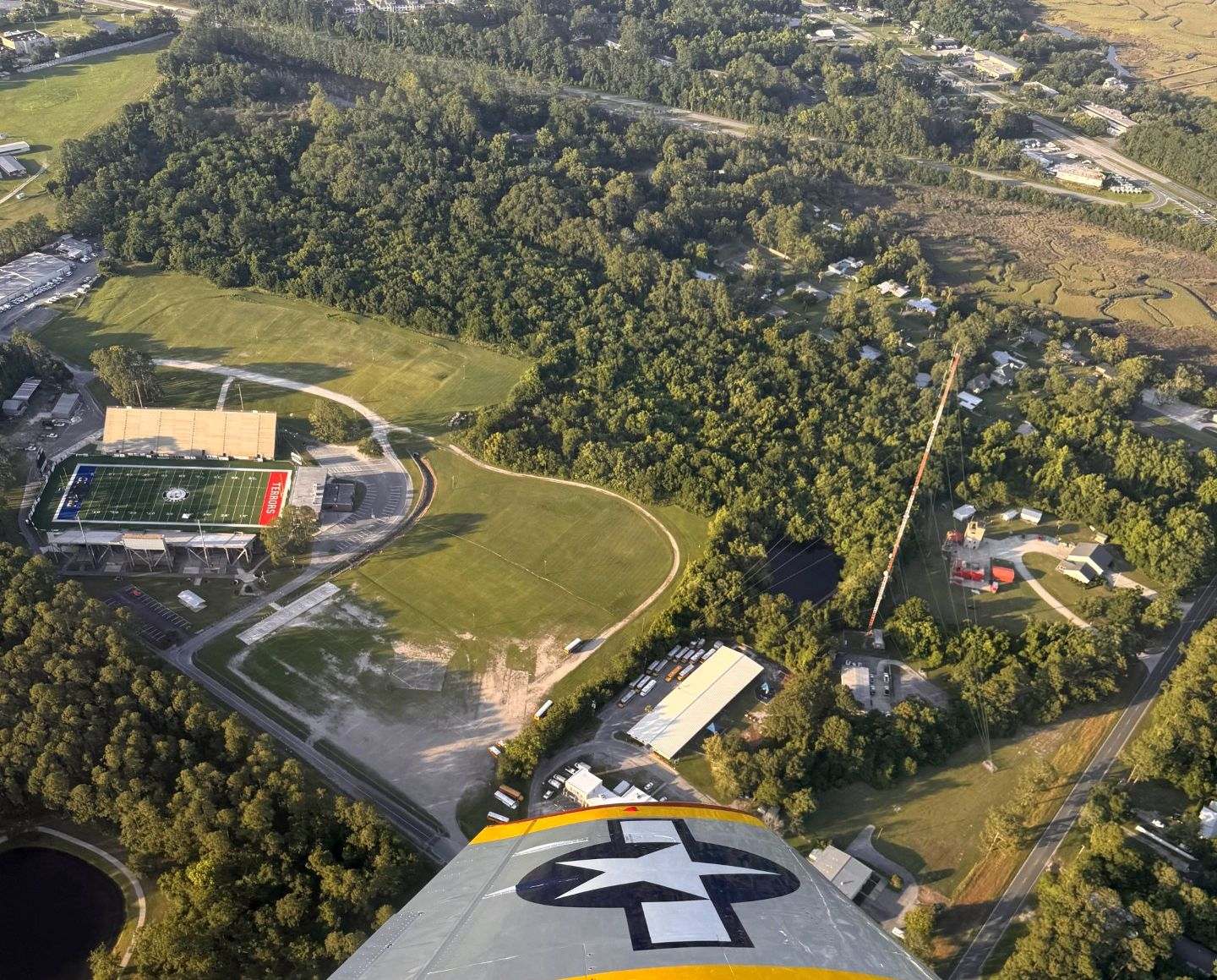 A 2014 aerial view looking northwest at the remains of the Glynco blimp field, with the runway of Glynco Jetport in the background.