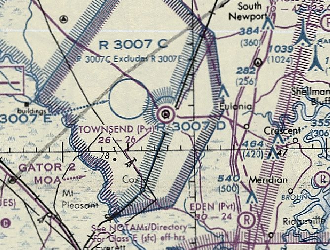 The April 1965 Jacksonville Sectional Chart (courtesy of Lee Corbin) depicted Townsend as a private airfield having a 2,600' unpaved runway, with adjacent circular Restricted Area R-3006 to the west.