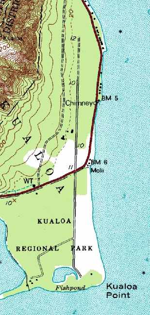 The 1943 USGS topo map (courtesy of John Voss) depicted the "Kualoa (Emer.)" airfield,