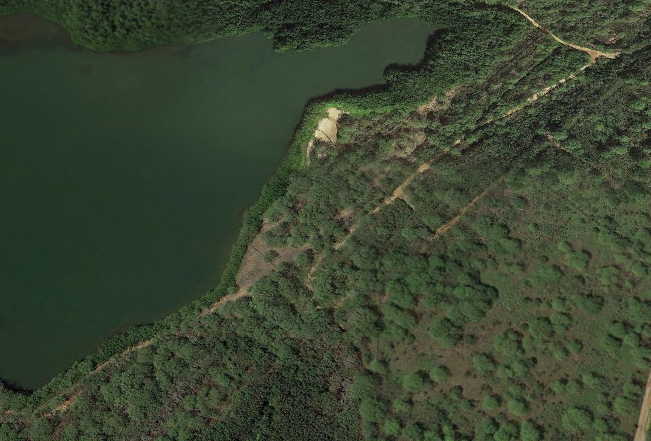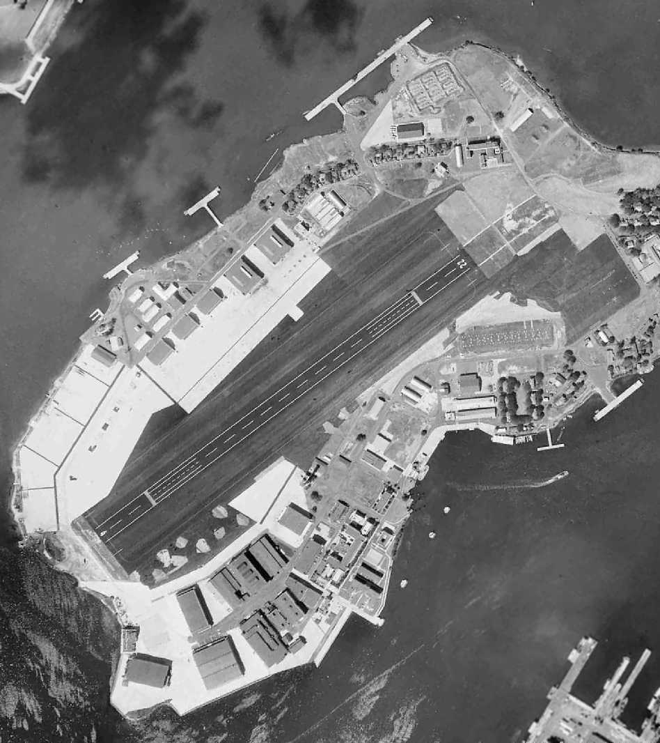 It depicted a single northeast/southwest runway directly along the eastern shore of the water, and a few small buildings on the east side of the runway.