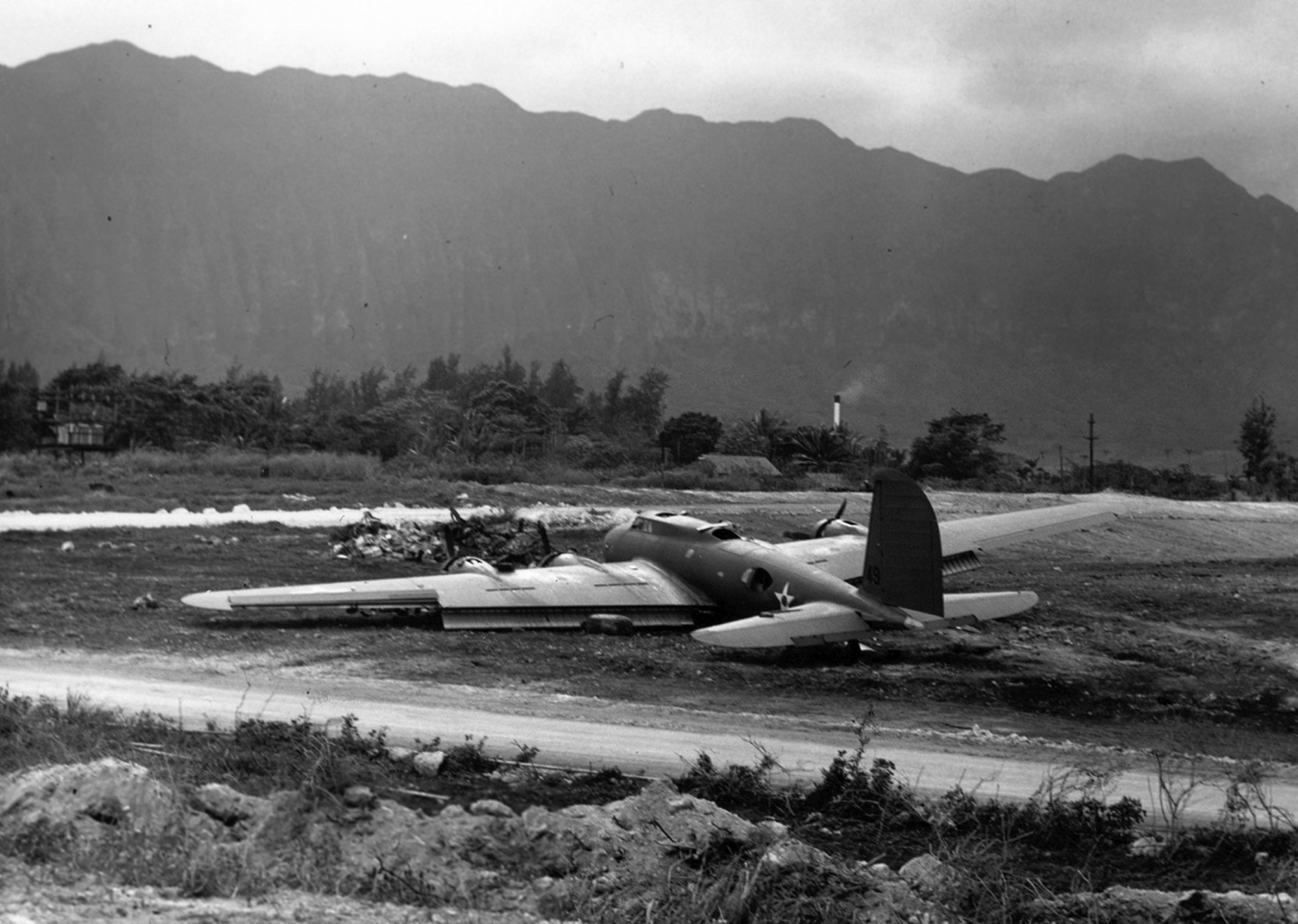 A 12/9/41 photo of a B-17C Flying Fortress bomber which had made a belly landing on a relatively short Bellows Field runway.
