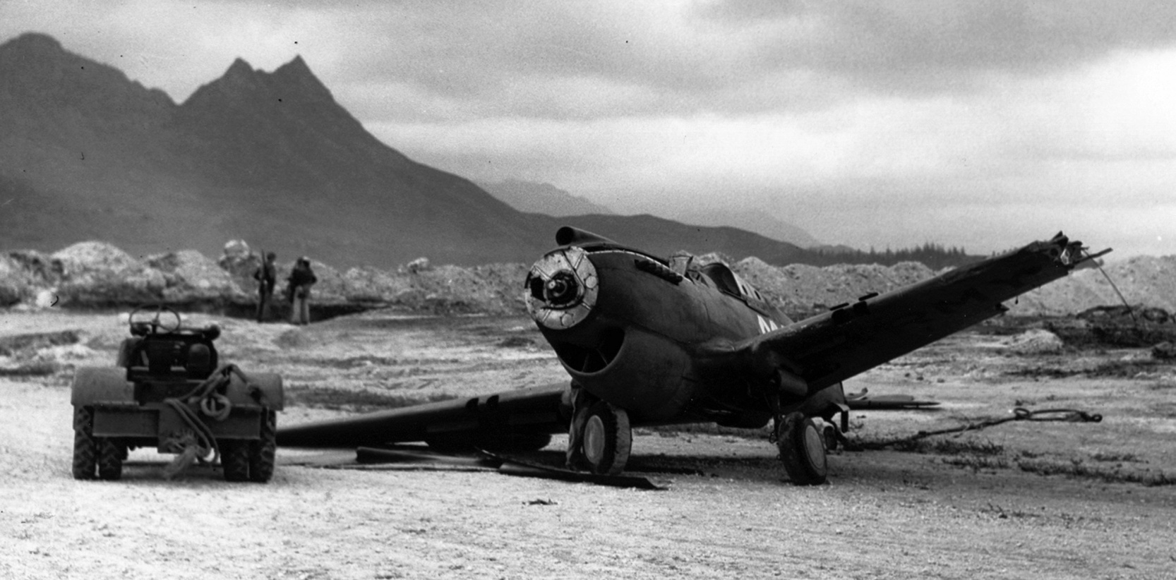 A 12/8/41 photo of a Curtiss P-40 Warhawk fighter off the side of the Bellow Field runway, after it had been damaged in the 12/7/41 attack.
