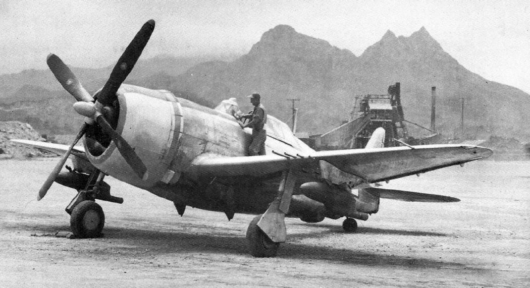 A WW2 photo of a Republic P-47D-23-RE Thunderbolt at Bellows Field (courtesy of John Voss), equipped with smoke-generating tanks mounted on the wing racks.