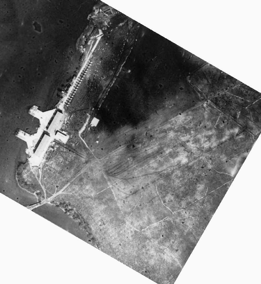 A February 1952 aerial view looking southwest at the Bellows runways (from the University of HI).