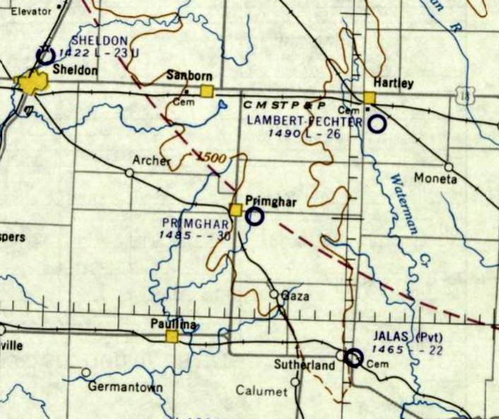 The earliest topo map depiction which has been located of Primghar Airport was on the 1964 USGS topo map.