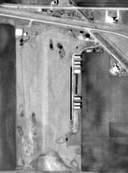 There were no ramps or hangars, but there did appear to be a very small building next to the road on the east side.