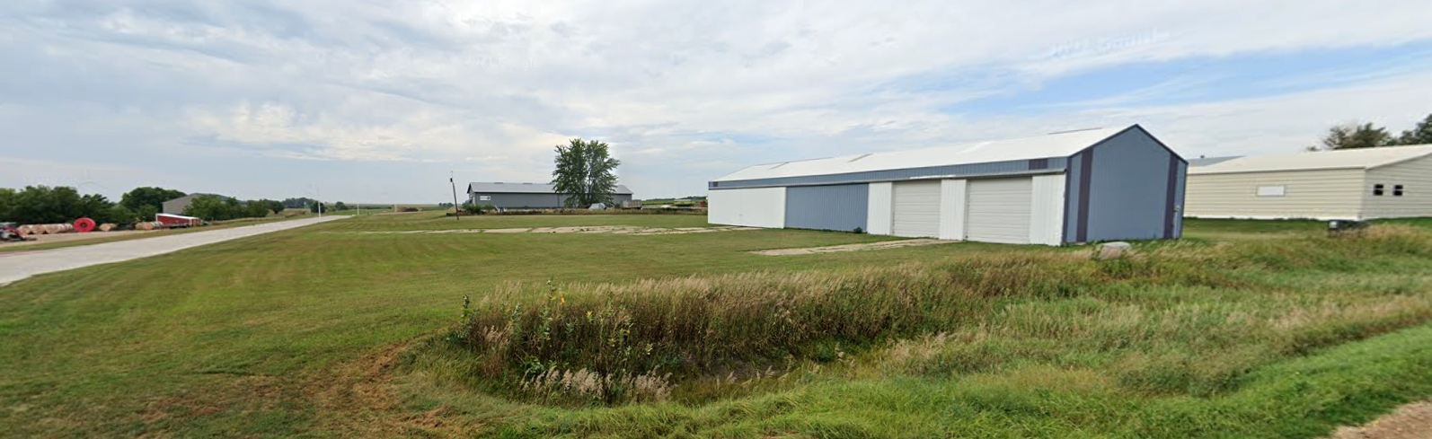 A June 2022 photo looking north at the Sioux Center Municipal Airport hangars & runway.