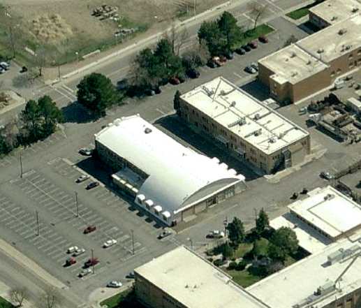 A circa 2005-2010 aerial view looking south at the former University Airport hangar.