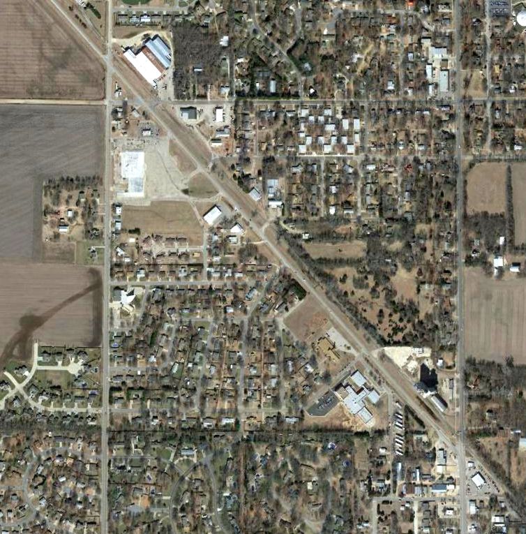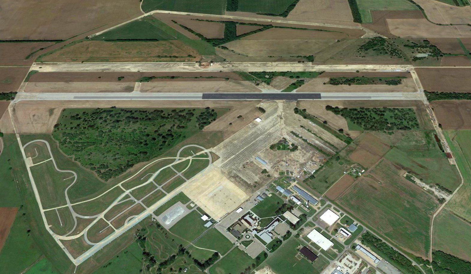 A 2017 aerial view looking southeast at the Arkansas City Airport site showed no trace remaining of the runway, but the hangar remained at the northwest corner (bottom-left) of the site.