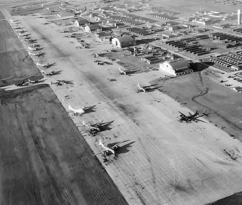 showing large numbers of B-29s, 5 large hangars, and the control tower.