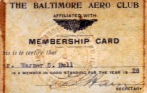 Warner Hull's 1928 membership card (courtesy of Mike Hull) from Park Heights' Baltimore Aero Club.