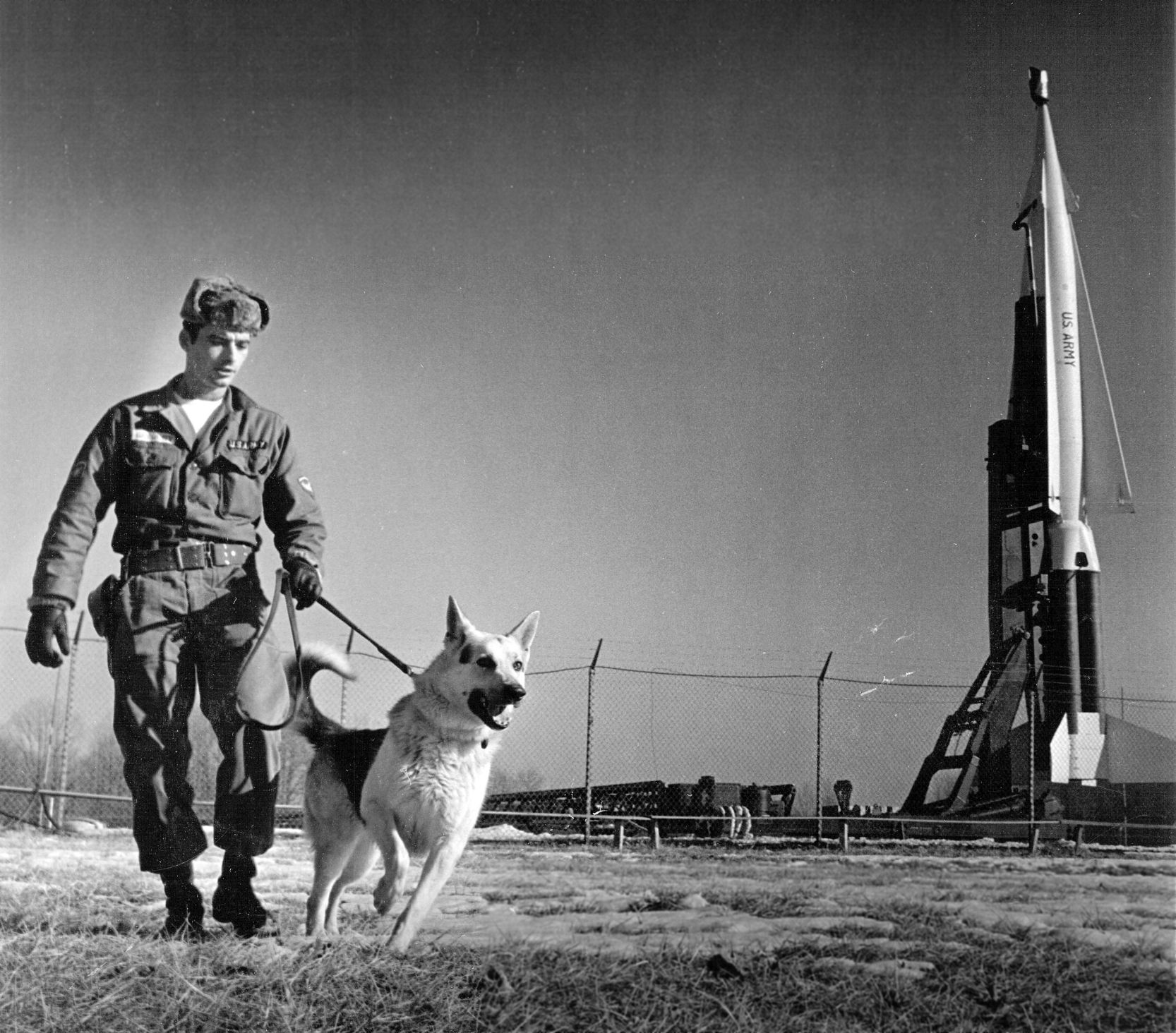 A 3/10/63 photo (courtesy of Tom Reed) of solider Charles Gregory & guard dog Lucky patrolling the Granite Nike missile launch site,