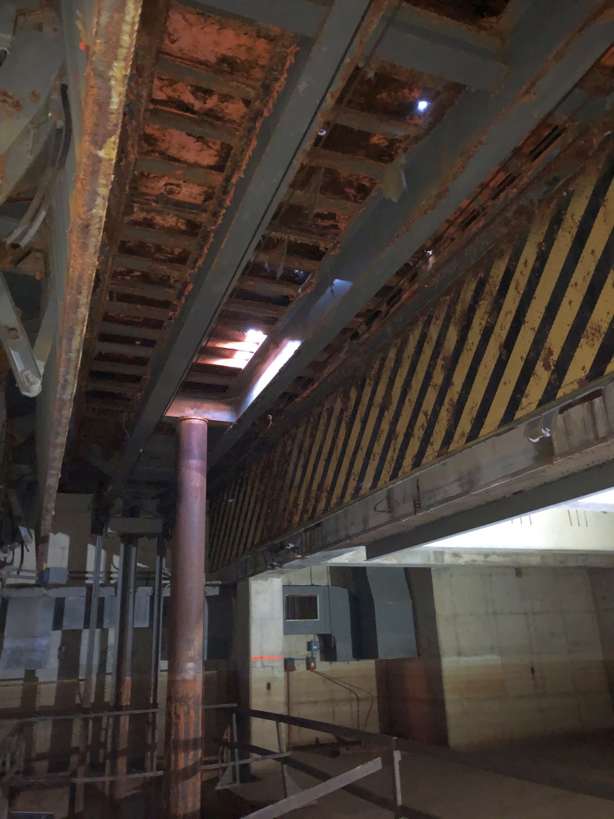 An 11/16/19 photo by Paul Freeman looking up from the underground interior of the Granite BA-79 Launch Site's southwest Nike Ajax magazine at the bottom of the elevated missile elevator.