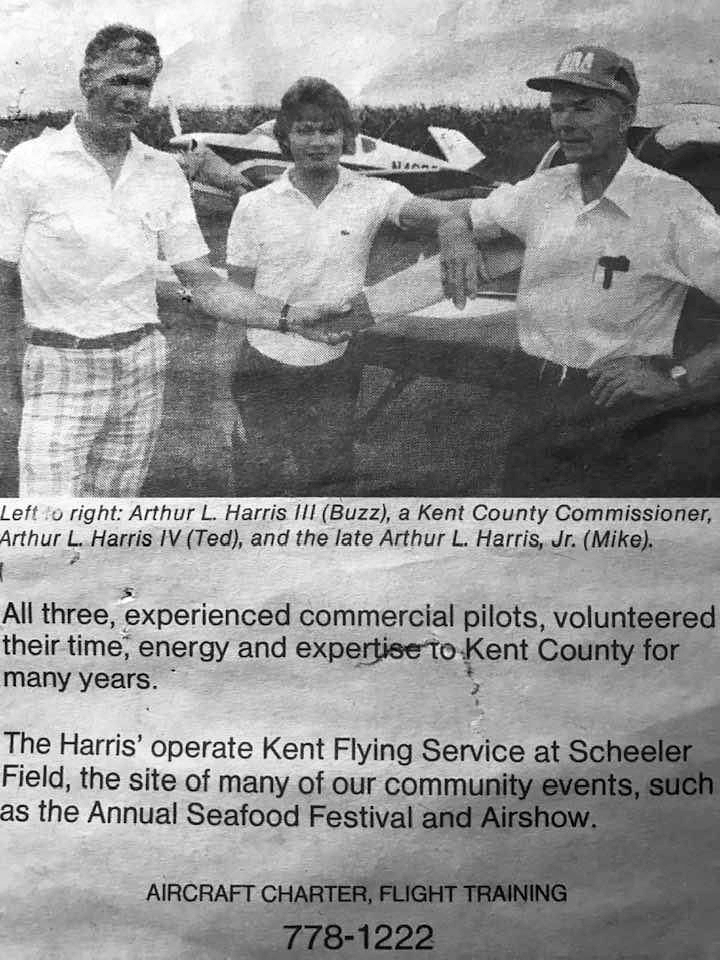 A circa 1980s advertisement for Scheeler Field's Kent Flying Service (courtesy of Matt Harris) featured 3 generations of the Harris family.